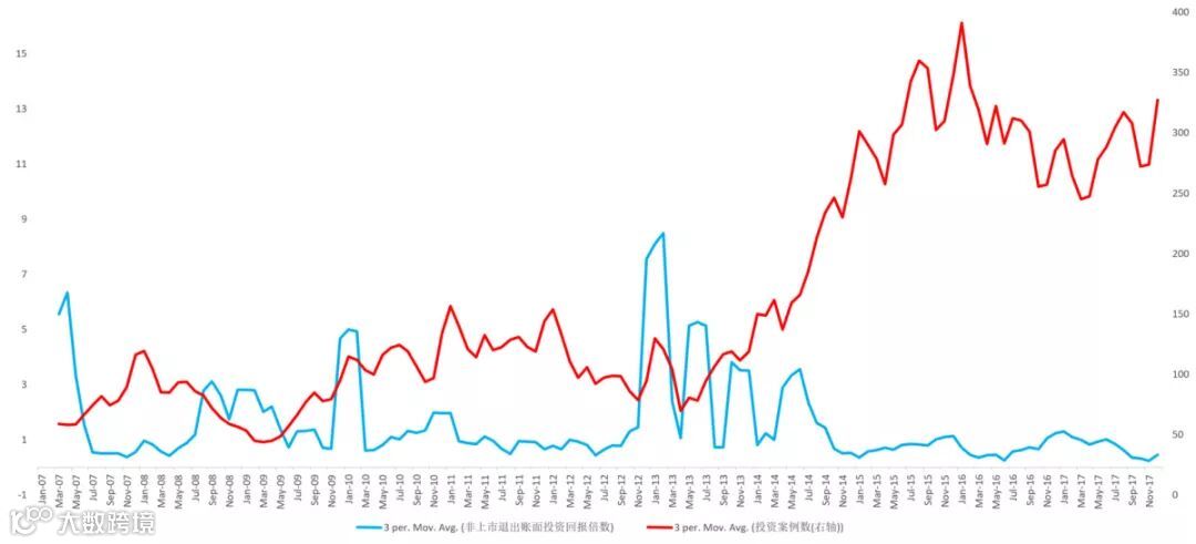 对于通过非上市方式退出的基金来说,投资更少的2007年至2014年中,平均投资回报率196%;投资变多了的2014年中至2017年底,平均投资回报率仅为76%——寒冬期是高潮期的2.58倍。