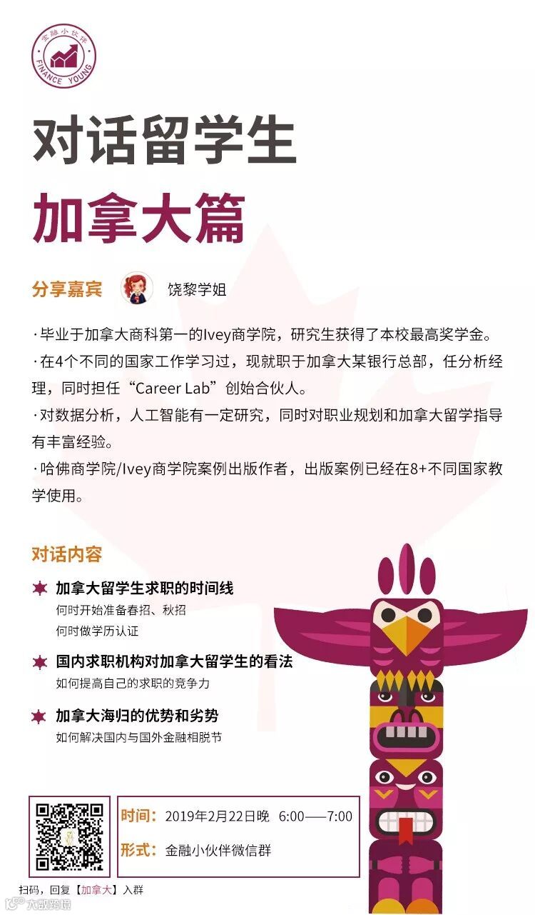 所以,本月22日(明天),金融小伙伴邀请到曾留学加拿大的传奇学姐饶黎,给大家分享加拿大留学生回国求职经验!
