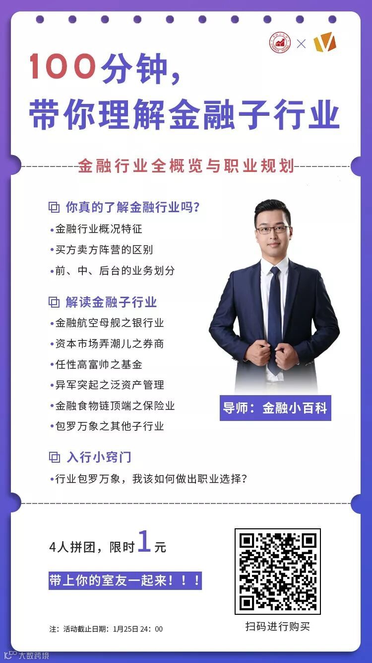 如果你还在纠结在择业阶段,欢迎报名参加#4人拼团1元购买#限时活动,100分钟带你浏览金融全行业!