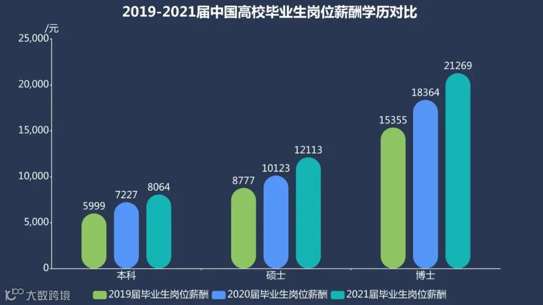 从 2019-2021 届中国高校毕业生岗位薪酬学历对比数据可以看出,毕业生的薪资待遇与学历水平呈正相关关系,学历越高,薪酬越高。
