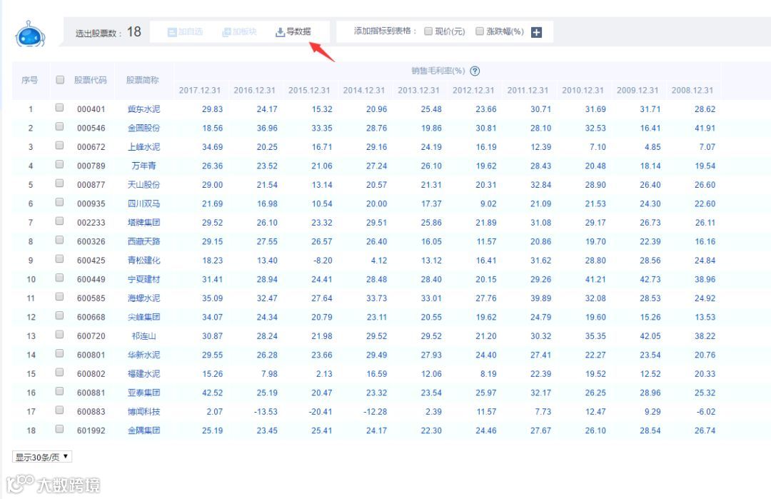 瞬间得出了所属水泥行业的18家上市公司毛利率数据。因此根本不需要我们去一年一年的去查找数据。同样你如果想找其它的指标输入关键字即可,相信聪明的你很快就会搞清楚这个网站该怎样搜索。ps:问财上面会有一个“导数据”的功能,这样我们直接导出所需要的数据了。