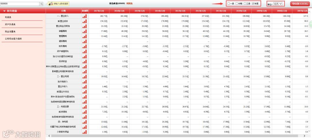 右上角还可以选择年报和季度报以及单位,同样还可以导出EXCLE。