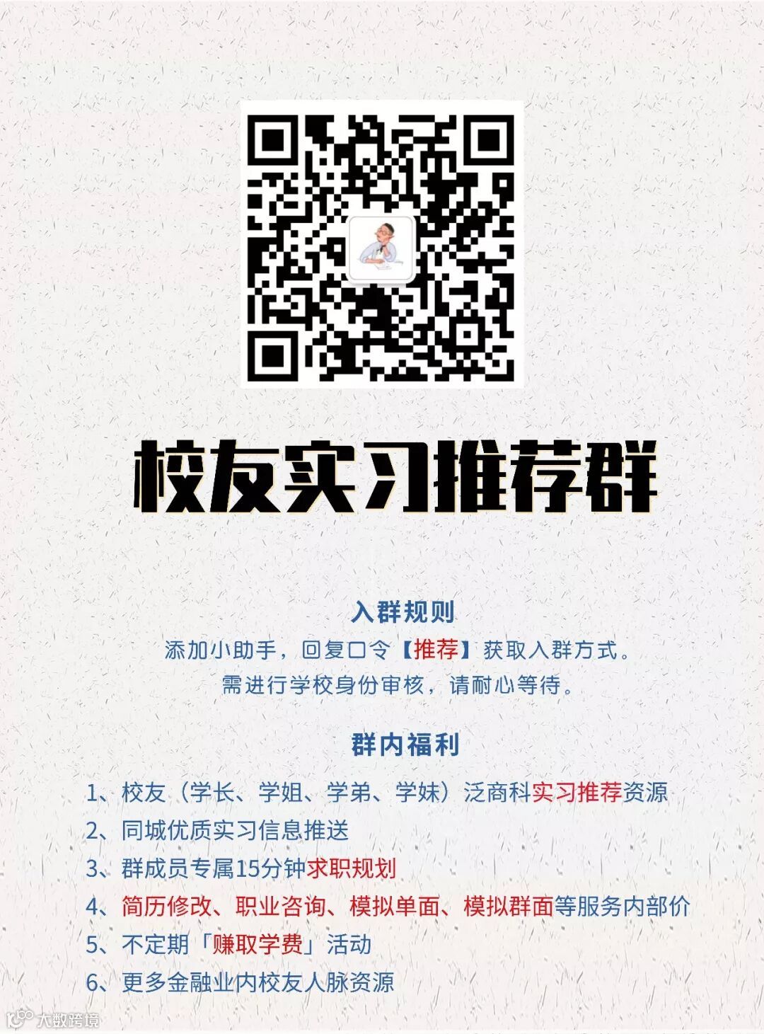 校友实习群的宗旨是:帮助学长学姐找到更靠谱的“接班人”,帮助学弟学妹找到更靠谱的内推机会!(本类群只作校友实习资源交流的平台使用,拒绝任何付费内推)