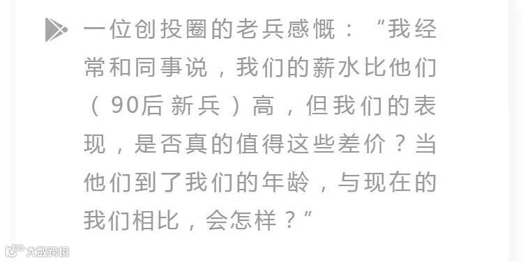 一位创投圈的老兵感慨:“我经常和同事说,我们的薪水比他们(90后新兵)高,但我们的表现,是否真的值得这些差价?当他们到了我们的年龄,与现在的我们相比,会怎样?”