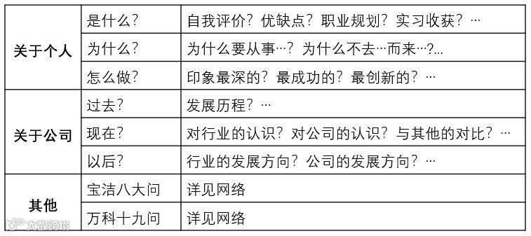 结构化面试问题一般分为两个切入点,一个针对个人一个针对公司,我会用表格的形式进行简略的展示。当然,在真正准备中肯定要更为详细和全面,希望对各位有所帮助。