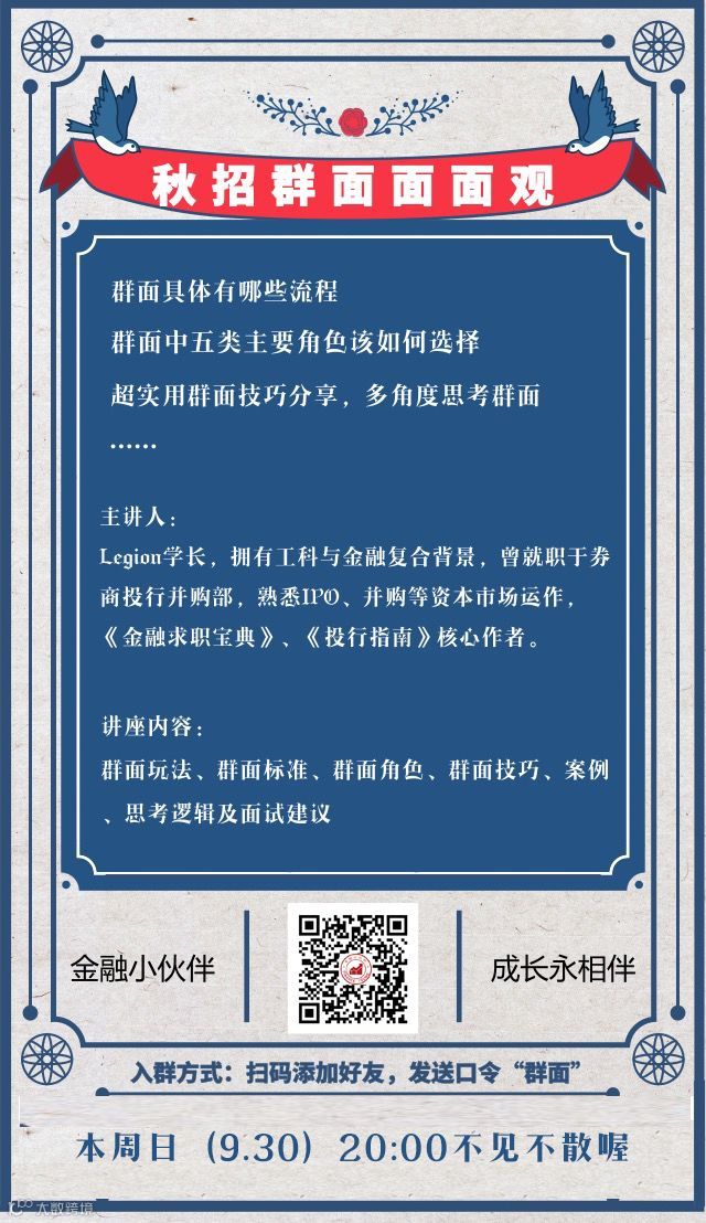 什么?你还没有拿到offer?赶紧听场讲座压压惊吧~这次我们带来了,史上可能最经典的校招【群面】指导群,六大知识点,资深求职导师,帮你在群面试中更加游刃有余!开课时间9月30日晚8点,赶快加入吧↓↓↓