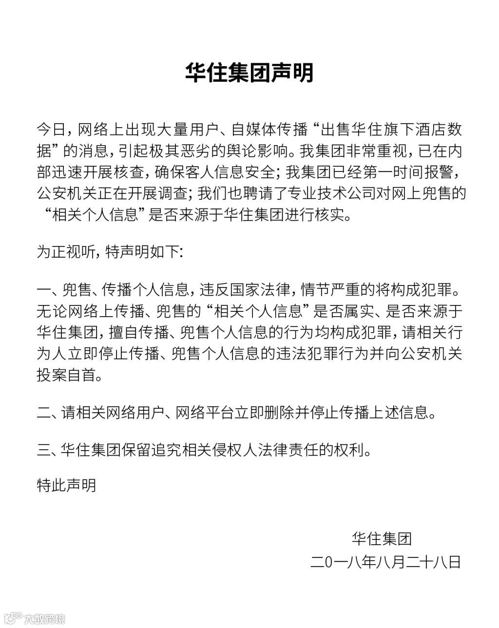 华住方面发出声明,声称将内部检查,并报警,同时对网络信息进行核查。