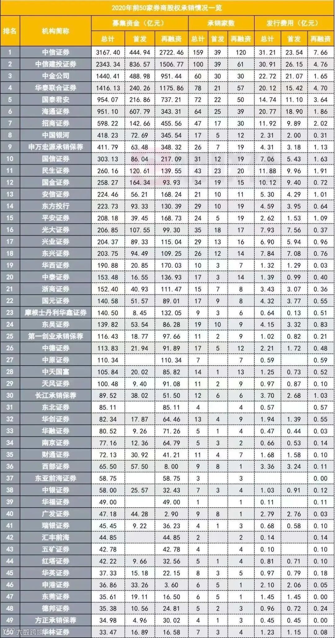 根据wind数据,中信证券更是以3167亿的股权承销规模拔得头筹,其中首发规模445亿元、再融资规模2722亿元。紧随其后的是中信建投证券,2020年的股权承销规模为2343亿元,其中首发规模837亿元,再融资规模1507亿元。