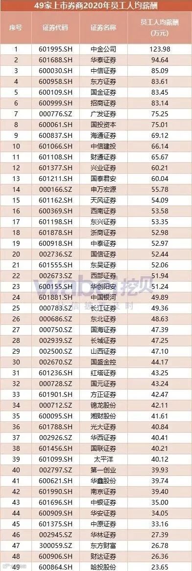 中金公司是唯一一家员工平均薪酬过百万元的证券公司,去年员工总数为9372人,人均薪酬123.97万元。华泰证券、中信证券分列以94.64万元和85.09万元位居第二、三名。另外,中信建投以66万元平均薪酬位居第10。