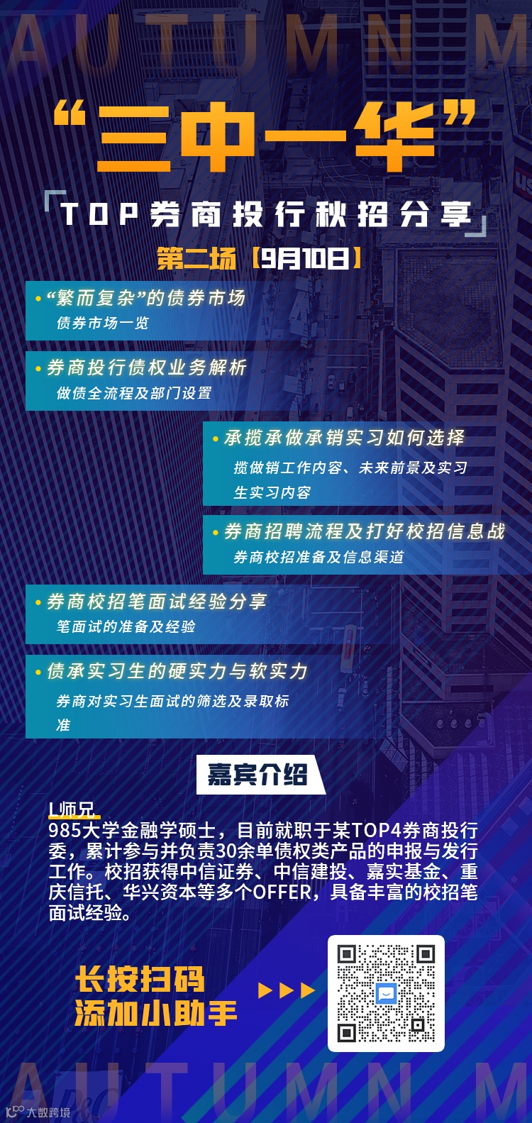 这将是一场空前的行业内部讲座!这将会成为你离“三中一华”国内顶级投行更进一步的高速通道。这将是一场你入职投行前必看的第一课!