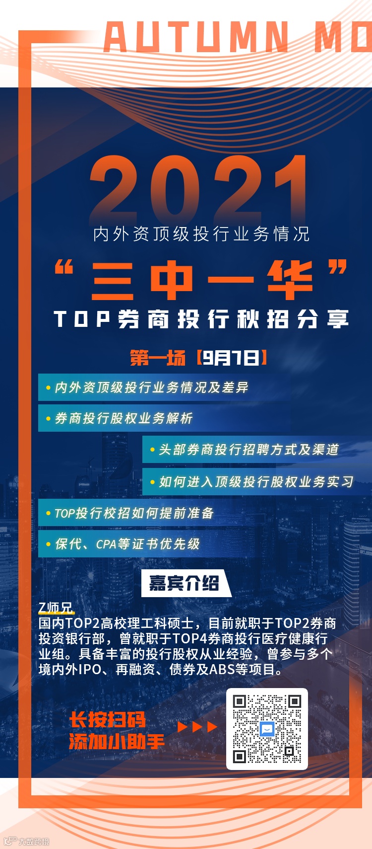 这将是一场空前的行业内部讲座!这将会成为你离“三中一华”国内顶级投行更进一步的高速通道。这将是一场你入职投行前必看的第一课!