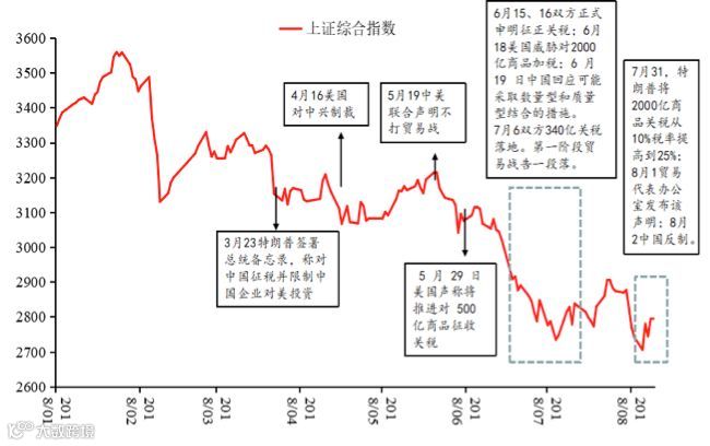 首先,我们观察上证指数。我们粗略地观察到,在贸易战早期,也就是今年3月至5月底左右,中国金融市场的一般性看法是中美贸易战的威胁只是“说说而已”,大家不相信贸易战会爆发,也没有为此做任何思想准备,认为中美之间的相互威胁只是在为下一步达成全面协议做准备,且这一协议很有可能达成,所以市场跌得不深。随后中美发表联合声明,达成了不打贸易战的共识,但市场总体上也不太在意这件事情,上涨也不强烈。但在6月中旬,中美双方正式承诺,将在随后的一段时间内开始征收关税。这使市场迅速调整预期,迅速认识到前期的想法过于“乌托邦”,中美贸易战其实是一个严肃的威胁。在这一条件下,市场出现了极大幅度的下跌,尤其是在中美贸易战两次关税落地的时点,市场的下跌都非常深。所以我们粗略猜测,中美贸易战是促使市场下跌的一个重要因素,但也不排除其他因素影响的可能。