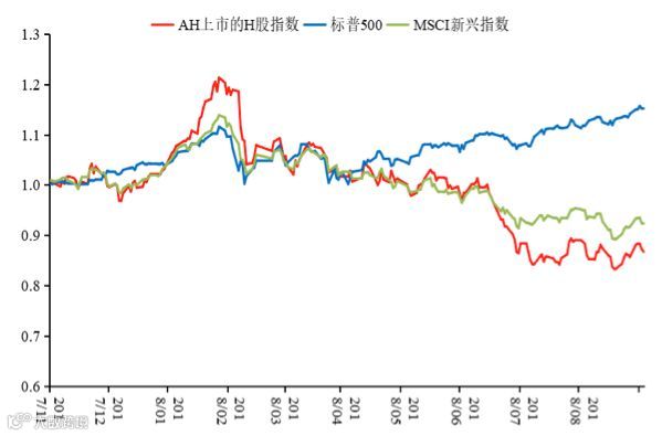 图3 AH上市的H股指数、标普500和新兴市场指数