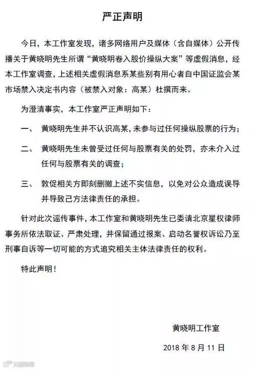 从结果看,证监会认为这是高某在张素霞等人不知情的情况下进行操纵的,所以黄晓明的个人账户并不受影响。