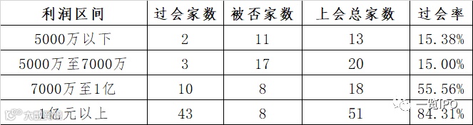 虽然证监会最近答记者问称对IPO企业的利润要求没有硬性提高,但数据显示,实际审核过程中证监会对拟IPO企业的利润门槛大幅提高,上会前一年不同利润区间过会率情况具体如下(不含撤材料企业):