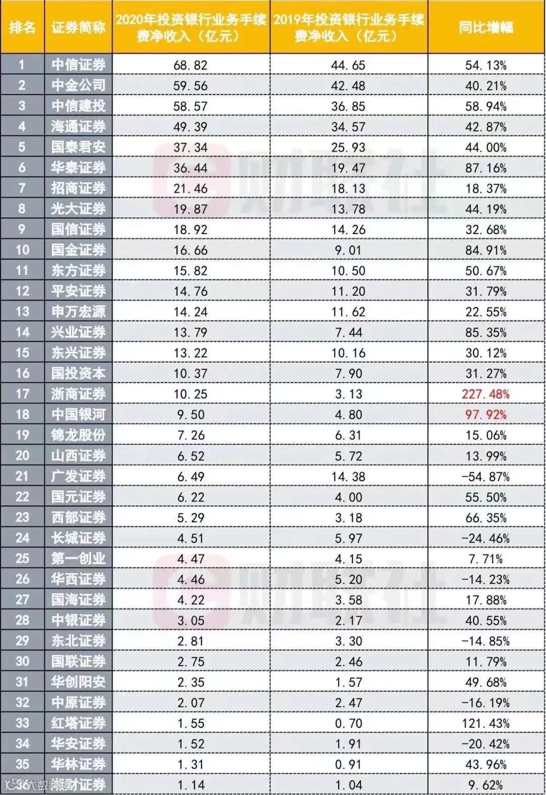 中金公司、中信建投在36家券商中位列二三位,2020年投资银行业务净收入分别为59.56亿元、58.57亿元,同比增幅分别为40.21%、58.94%。