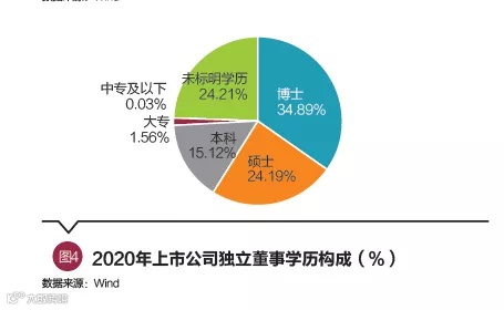 我们来看个数据就知道了,截至2020年末,在职独立董事拥有博士学历的占比46.04%、硕士学历的占比31.92%。