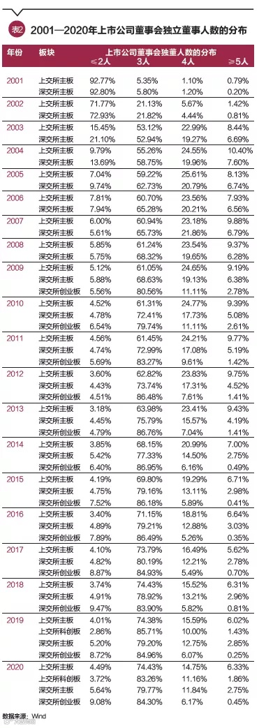 上市公司董事会中独立董事的占比较低,从最初的约九成的董事会中,只有2名独立董事,发展到现今的约八成的董事会中,只有3名独立董事。