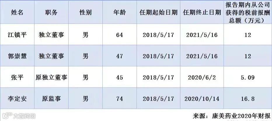 康美独董近年来的税前报酬多为12万元/年,江镇平、李定安、张弘、郭崇慧、张平在担任独董期间分别从康美领取的报酬总额为56.26万元、40.95万元、27.09万元、31.01万元、24.10万元。