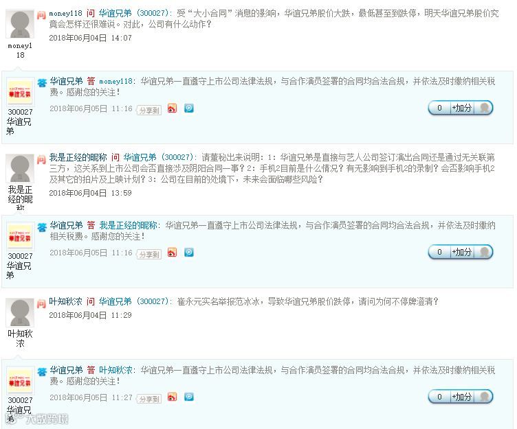 最后,有一个小细节值得注意,6月4日,除华谊外,其他公司纷纷以公告的形式表态不存在阴阳合同,华谊直到6月5日,才在深交所互动平台上回应。