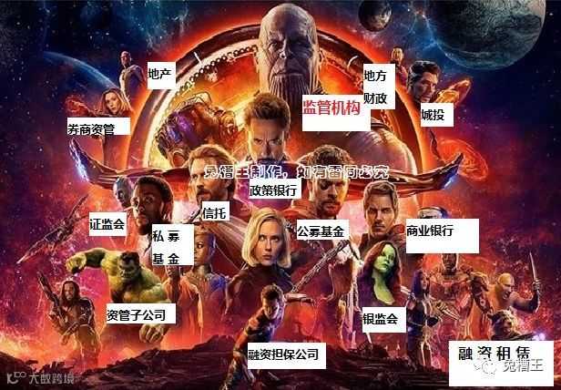 突然,灭霸出现,用“16个过热城市融资受限”等政策将地产砍个半死,券商资管急忙救助,灭霸即将对地产一招毙命时,信托突然出现!