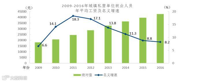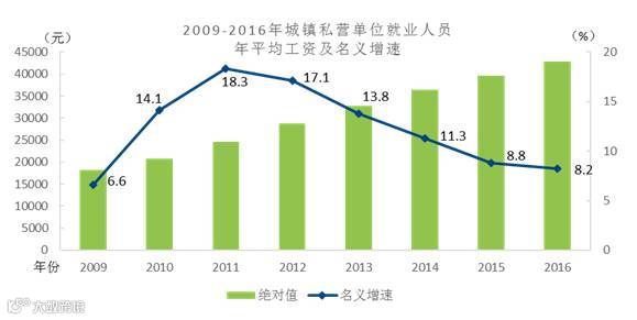 2016年全国城镇私营单位就业人员年平均工资为42833元,与2015年的39589元相比,增加了3244元,同比名义增长8.2%,增速比2015年回落0.6个百分点。扣除物价因素,2016年全国城镇私营单位就业人员年平均工资实际增长6.0%。