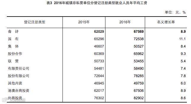 2016年全国城镇非私营单位就业人员年平均工资为67569元,与2015年的62029元相比,增加了5540元,同比名义增长8.9%,增速比2015年回落1.2个百分点。扣除物价因素,2016年全国城镇非私营单位就业人员年平均工资实际增长6.7%。