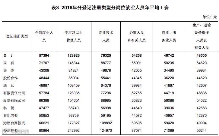国家统计局对一套表联网直报平台16个行业门类的约96万家企业法人单位调查显示,2016年全部一套表平台被调查单位就业人员年平均工资为57394元,比2015年增长7.0%。其中,中层及以上管理人员123926元,增长7.3%;专业技术人员76325元,增长7.5%;办事人员和有关人员54258元,增长6.4%;商业、服务业人员46742元,增长5.6%;生产、运输设备操作人员及有关人员48005元,增长5.9%。中层及以上管理人员平均工资最高,是一套表平台全部就业人员平均水平的2.16倍;商业、服务业人员平均工资最低,是一套表平台全部就业人员平均水平的81%。岗位平均工资最高与最低之比为2.65,比去年扩大0.04。