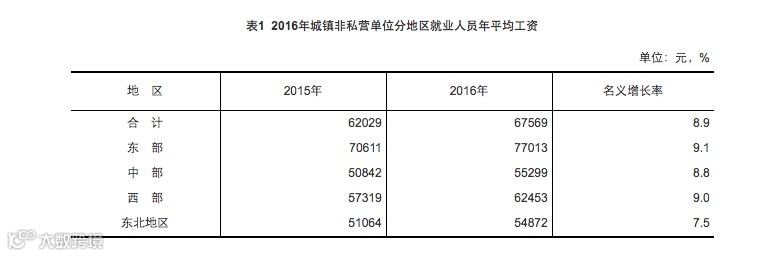 分四大区域看,2016年城镇非私营单位就业人员年平均工资由高到低依次是东部、西部、中部和东北地区,分别为77013元、62453元、55299元和54872元,同比名义增长率由高到低依次为东部9.1%、西部9.0%、中部8.8%和东北地区7.5%。最高和最低区域的平均工资之比为1.40,比上年扩大0.01。