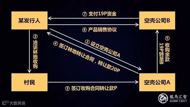如图2所示,发行人第一步是先设立一家空壳公司A,专门用于与村民签订林地使用权转让合同;第二步是发行人与村民洽淡好林地使用权转让条件;第三步由空壳公司A与村民签订林权转让协议,并按约定支付村民转让款;第四步是空壳公司A与发行人签订林权转让协议,发行人按高价支付转让款;第五步是空壳公司A将剩余未使用完的林权转让款划转到空壳公司B;第六步是发行人与空壳公司B签订商品销售协议,空壳公司B将收到的林权转让款转回至发行人。经过上述过程后,除实际支付村民的林地转让款P外,其余资金19P从发行人以收购无形资产名义转出后,经空壳公司A、B,以销售回款的形式又转回发行人,实现了资金的循环,同时发行人账面虚增了19P的无形资产和19P的营业收入。