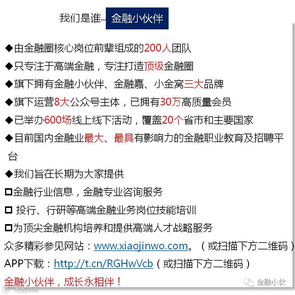 金融小伙伴致力于搭建一个金融垂直领域职业信息分享和交流公益平台,通过持续不断的公众号推文和线上线下活动,提供及时、全面、高效的行业招聘信息和职场提升经验。目前,我们已吸引了超过100万粉丝,在海内外金融学子和在职人士中均享有盛誉。