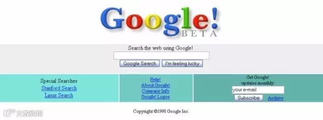 Google1998年的页面,标识后面也有个惊叹号,可能在模仿Yahoo!