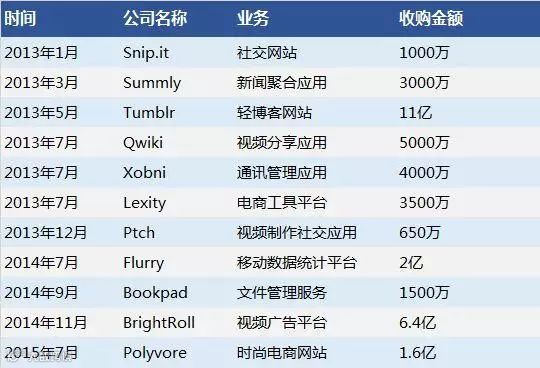 2012年,“硅谷女神”玛丽莎·梅耶尔出任雅虎CEO,先后收购了50多家公司,涉及社交网站、轻博客、视频、游戏、电话会议系统等领域。
