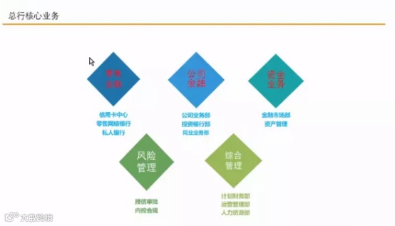 从架构来看,4大国有行总行有40+个部门,大致可以按照前台部门(资产管理部、金融市场部、私人银行部、信用卡部等)、中台部门(风险管理部、信贷管理部、内控合规部等)、后台部门(审计部、人力部、计划财务部等)分为3类。