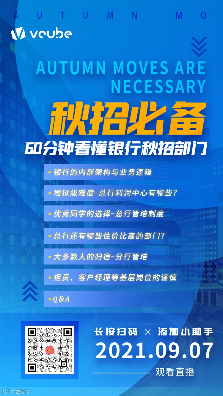 为了让大家更好的认识银行,更高胜率的斩获银行的秋招offer金融小伙伴特别为大家准备了一场全方位解析银行总行的讲座,还有免费福利可以领!