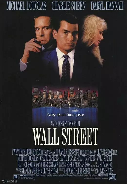 上世纪初美国“强盗贵族”式的企业家。 影片讲述了报业大王凯恩的一生。影片以一位报业大亨凯恩之死揭开了序幕,并通过他的人生经历和事业的兴衰史,见证了一桩资本主义神话下的复杂真相。02华尔街 Wall Street (1987)