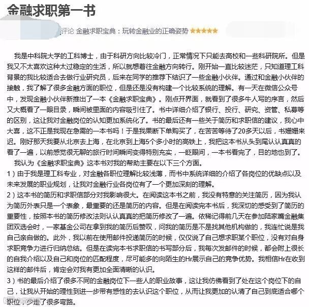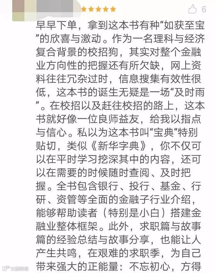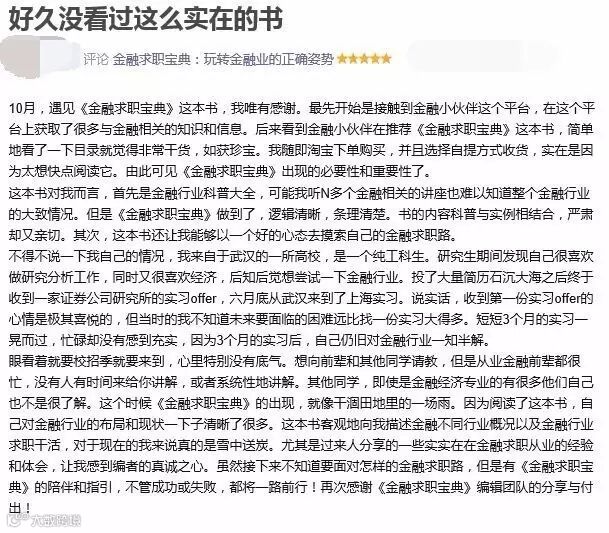 “这本书打动我的地方很多。其中一个,书是由很多正在从事各类金融工作的小伙伴们用亲身经验和真诚的心合作写成的。我在伦敦商学院读金融硕士的时候,特别期待有前辈或师兄给指导金融机构择业的机会和选择,例如投行、咨询、PE、对冲基金等行业的比较和什么样的人适合什么样的机会等……”
