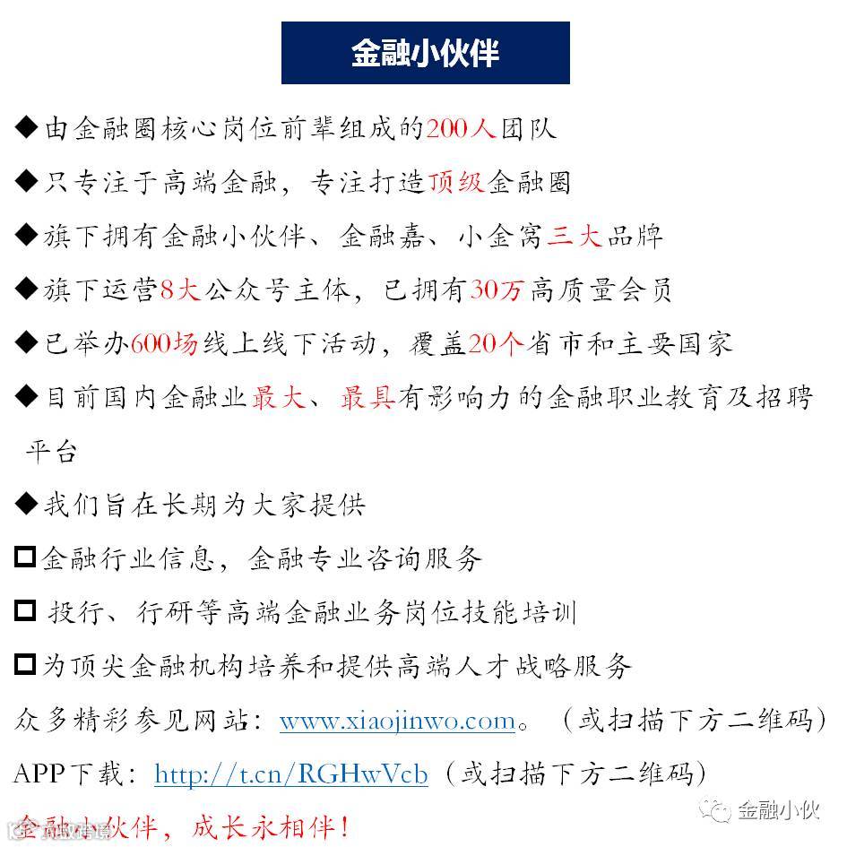 金融小伙伴致力于搭建一个金融垂直领域职业信息分享和交流公益平台,通过持续不断的公众号推文和线上线下活动,提供及时、全面、高效的行业招聘信息和职场提升经验。目前,我们已吸引了超过100万粉丝,在海内外金融学子和在职人士中均享有盛誉。