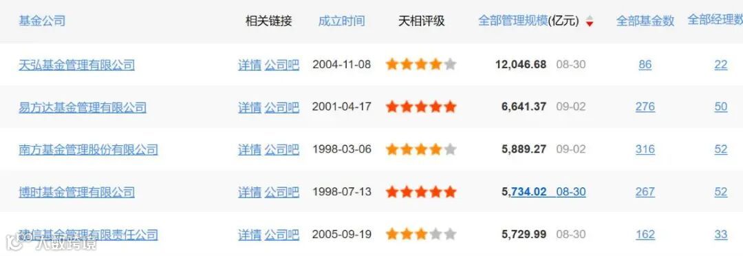 一般来说,我们按照基金规模排名的前五基金公司如下: