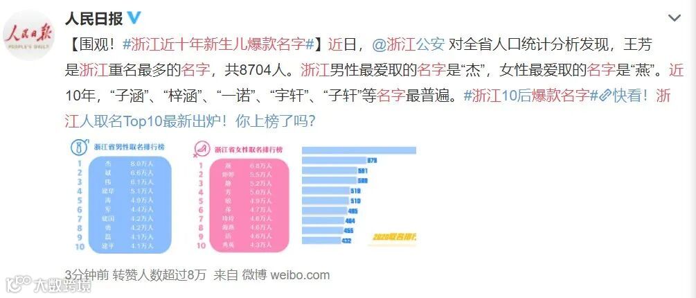 近日,“浙江近十年新生儿爆款名字”频频登上了微博热搜榜。
