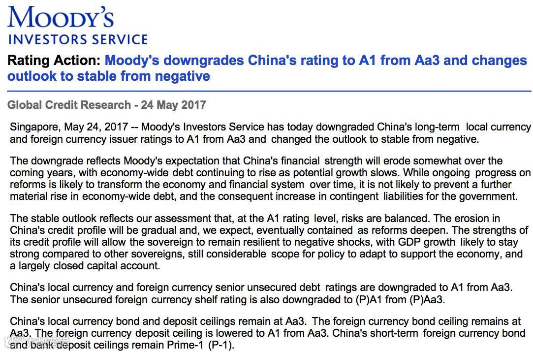 在新闻稿中,穆迪将中国本币和外币高级无抵押债券评级由Aa3下调至A1,已核准但未发行的高级无抵押外币债务的评级也从(P)Aa3 下调至(P)A1。