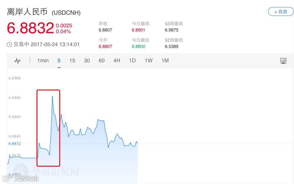 上述消息后,离岸人民币短线跳水近70点触及6.89关口。