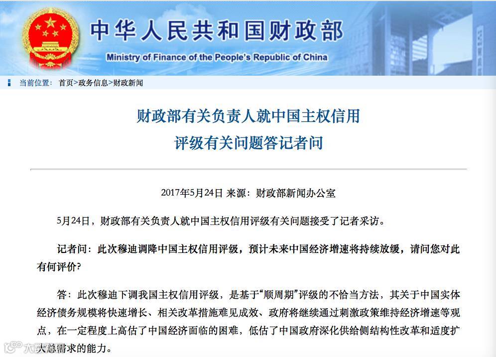 对于穆迪此次调降中国主权信用评级,财政部于今日午间作出回应,表示: