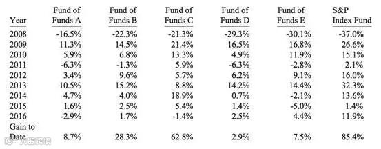 事实是,我们处于一个“中性”的环境中。在这样一个环境中,五支基金到2016年年底的按年复利计算的平均收益率仅仅为2.2%,也就是说在这五支基金中各投资100万美元到现在你会获得22万美元的利润。而指数基金的收益会高达85.4万美元。