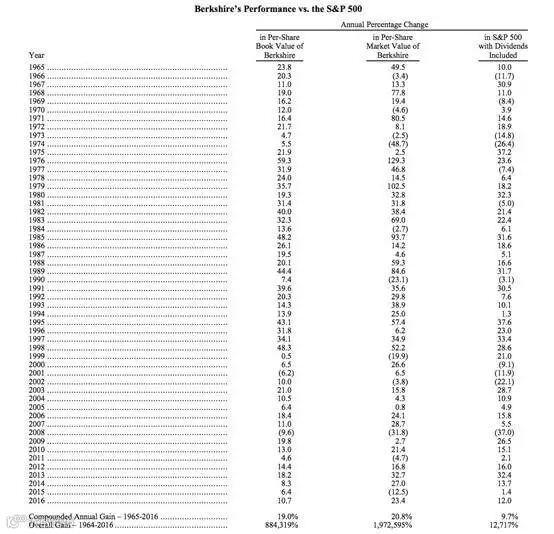 伯克希尔公司业绩同标普500指数历年以来的对比(第一列为伯克希尔每股账面价值年度增幅,第二列为伯克希尔每股市值年度增幅,第三列为标普500指数含股息在内的年度增幅)