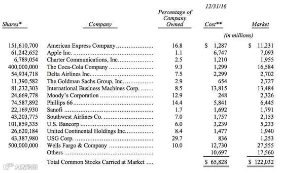 2.这是伯克希尔·哈撒韦公司实际购买股票的成本价,也是公司计算资本所得税的根据。在一些情况下,符合一般通用会计标准的成本与实际成本不相同,这是因为根据一般通用会计标准的规定,公司对一些股票进行资产减值计提处理。