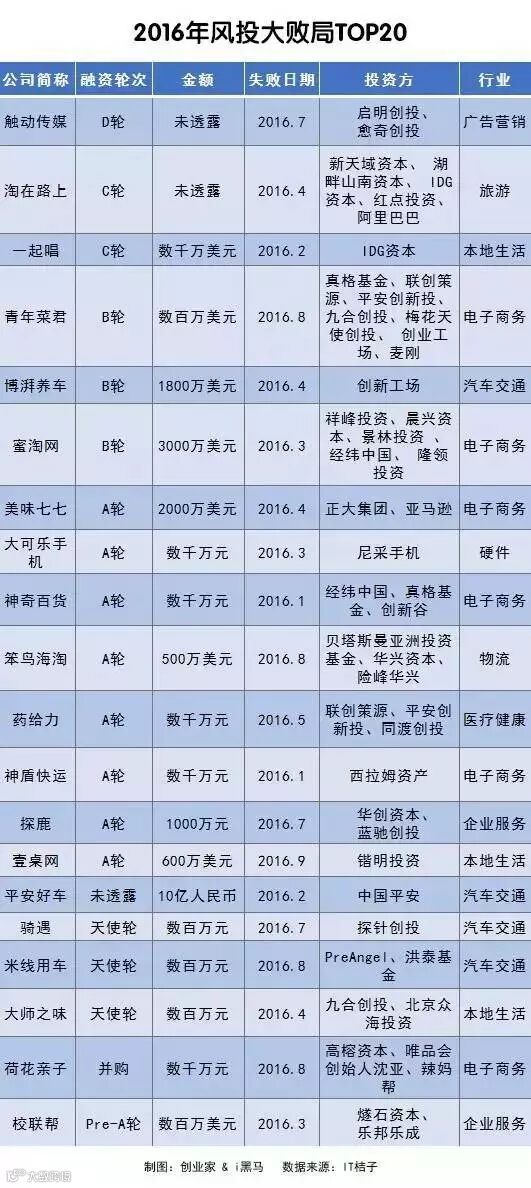 在2016年倒闭的400余家项目中,创业家&i黑马根据项目的融资额度、行业代表性和项目的百度指数等指标,选出了在这一年中,在各自领域中,它们的倒闭影响力最为巨大的20家公司。