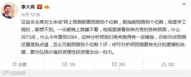 “我是清华大学工程专业的,数理化是本行,毕业论文是计量经济学,都没敢想(预测指数)。但出差到外地,电视上操着山西话、山东话、江苏话、浙江话的分析师都能预测到个位。”刘士余指出,好的政策都被“黑哨”给吹歪了,一些券商的经济学家明目张胆的胡说八道,要加强对“黑哨”的处罚力度。