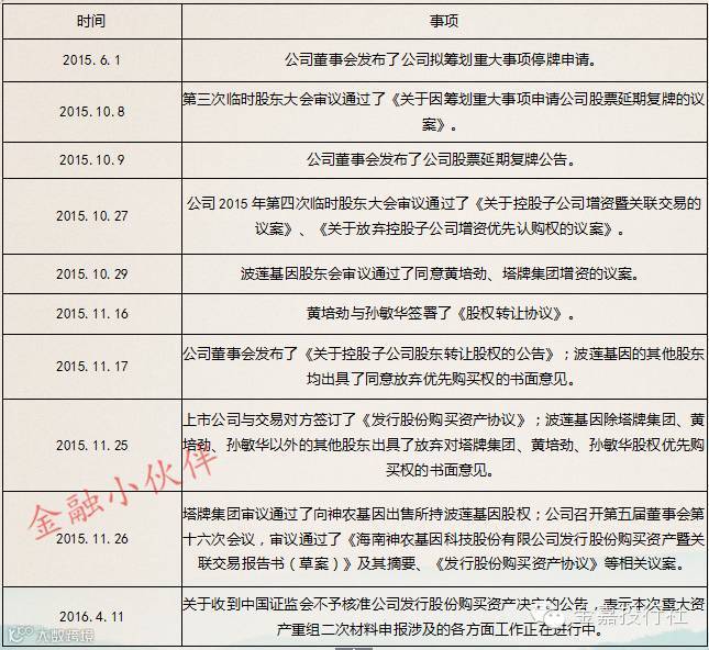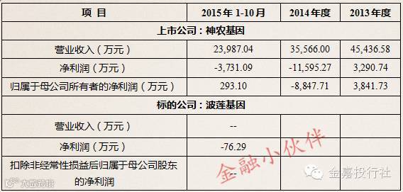 2015年1月15日,证监会对神农基因的重组方法下发《《中国证监会行政许可项目审查一次反馈意见通知书(153607 号)》,其中提到波莲基因的无形资产采用超额收益法进行评估,但未设置业绩补偿条款,请公司补充披露本次交易未设置业绩补偿条款是否符合相关规定。对此神农基因在2月4日发布的《发行股份购买资产暨关联交易申请文件一次反馈意见之回复》中增加了业绩承诺的相关内容如下:乙方确认并承诺,波莲基因 2016 年度、2017 年度和 2018 年度扣除非经常性损益后归属于母公司所有者的净利润不低于-160.30 万元、-3,470.73 万元和-3,277.14 万元。