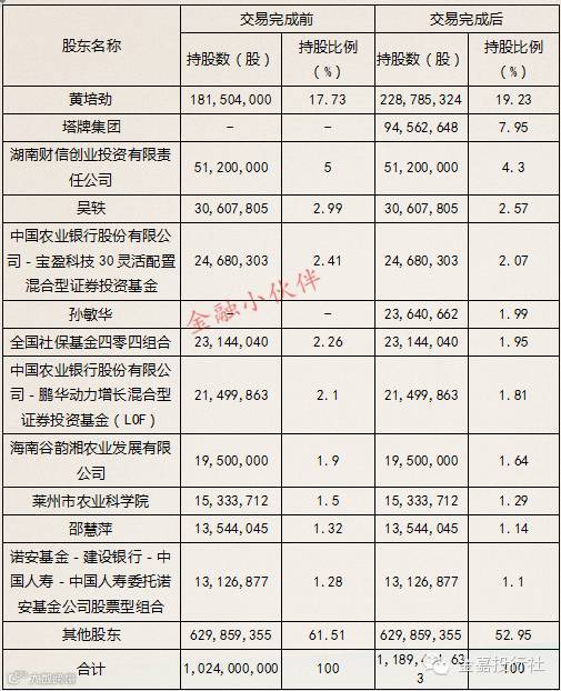 神农基因的子公司,即本次交易的标的公司波莲基因在2015年4月设立,由神农基因以67%的股权控股。2015年10月波莲基因引入新股东塔牌集团和黄培劲对其增资,塔牌集团向波莲基因缴纳了4亿元的出资,黄培劲向波莲基因缴纳了3亿元的出资,增资后的波莲基因股权被塔牌集团以35.15%的股权控股,神农基因持股比例被稀释到25.78%,成为第二大股东,黄培劲持股26.37%成为第三大股东。